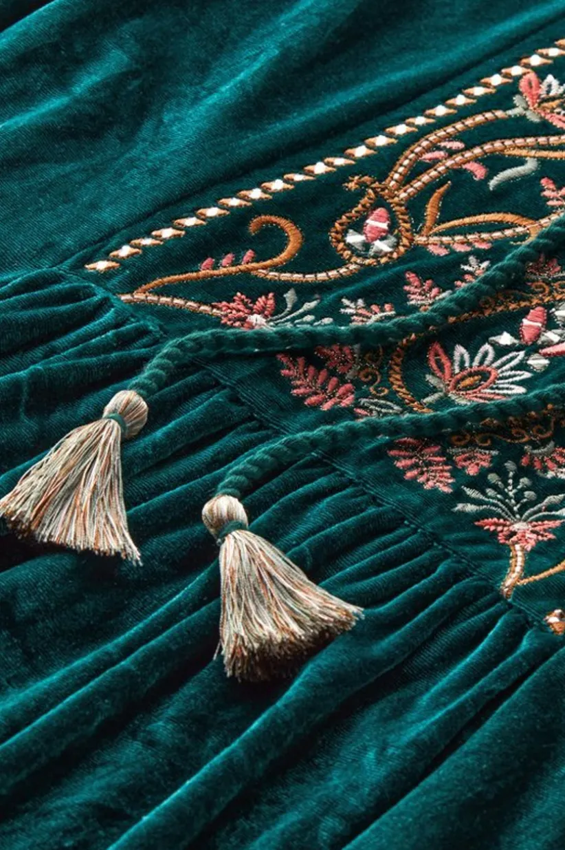 Make a magical entrance in divinely drapey stretch knit velvet. All eyes will be on you with the rich sheen of the green, the gilded ornate embroidery and the tassels that add a playful twist. Endlessly flattering, too, thanks to princess seaming and shirring that complement all the right places.