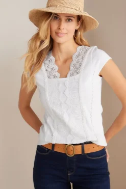 Lace panels at the neckline show off the dainty details of this cap sleeve top’s scallop lace embellishments. Cotton spandex ribbed side panels create a flattering shape for this cotton jersey style.