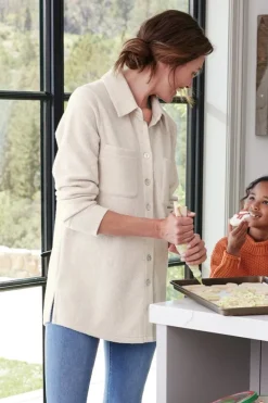Imagine his collared shirt, roomy and so comfy, but styled for you and in the softest, coziest fabric. Full button placket to button (or not), patch pockets, side seam slits.