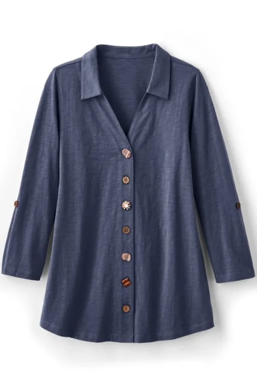 Danielle is back and better than ever with an updated silhouette and, of course, the whimsical mix of eclectic buttons on the front placket. It starts with a quality, weighty cotton that feels great. A roll-tab on the 3/4 sleeves allows for effortless cuffing. The curved hem is fresh and easy. For a better fit, we recommend sizing up in this style.