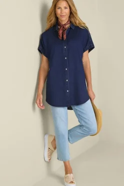 Clean minimalism is all about understated ease and this top, a longtime Soft favorite, has it in spades. This button-front shirt in pure TENCEL™, a lighter weight, drapier, softer version of denim, has a relaxed attitude with dropped shoulders and a casual curved hem. TENCEL™ is a trademark of Lenzing AG.