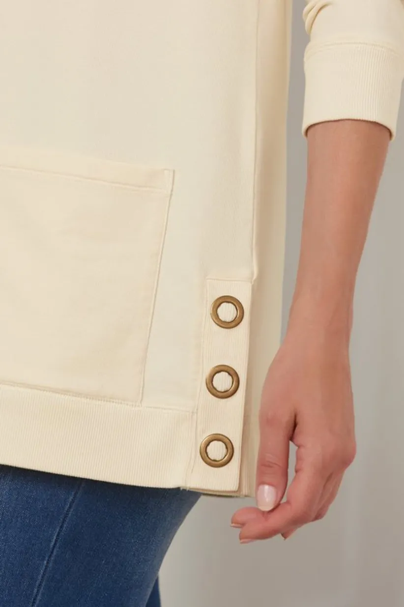 Blending the sensibility of a cozy pullover with a long knit tunic, this easygoing top is enlivened with large snaps at the front placket and side slits for extra fun. Handy patch pockets, long sleeves, contrast ribbing at the hem and cuffs.