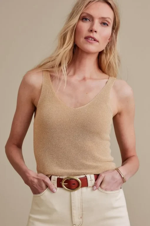 Your wardrobe’s ultimate unsung hero steps out into the spotlight with this slim-fit tank in a shimmering sweater knit. It’s a great layering piece under jackets, cardis, and open weave sweaters, but you can also let it shine solo with a pretty statement necklace. Scooped V-neck, scoop back.