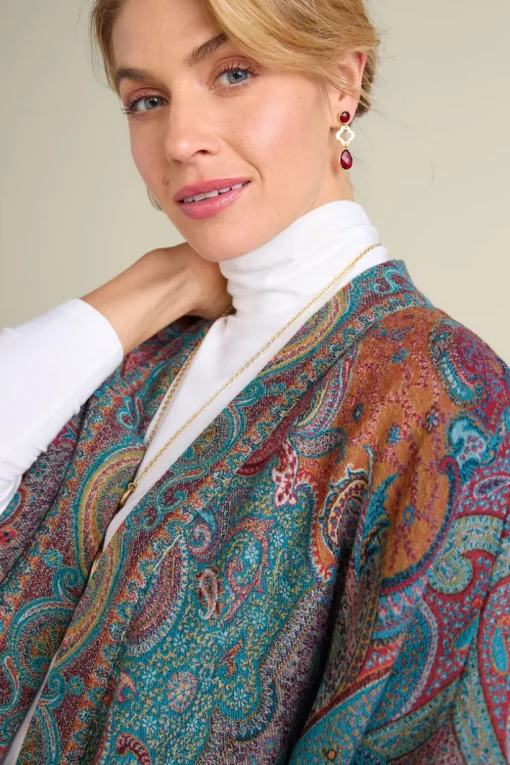 Stand tall with shoulders back in this handwoven showpiece. Swirls of allover paisley cascade down the drapey silhouette, making it an artful addition to any outfit.