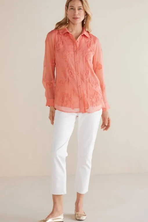 This tunic has layers … literally! The sheer top layer boasts beautiful allover embellishments. Complete with a tonal body lining, shirt collar, button placket and sleeve cuffs, too. Compliments incoming!