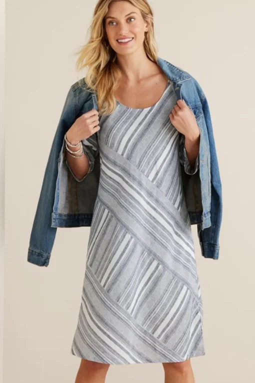 An easy linen-blend dress is everything we love about spring and this one has so much more to love, love, LOVE. Blended with viscose, the fabric is so comfy and stays looking great all day. The paneled stripes are unbelievably flattering, visually slimming in a shapely silhouette. It’s the perfect, running around, dress it up or down, dress. Front/back lining, knee length, 3/4 sleeves.